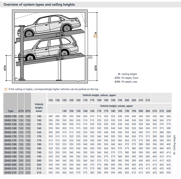 - Standard design: 2,000 kg per parking space, optional max. 2,600 kg SP/DP or max. 3,000 kg SP